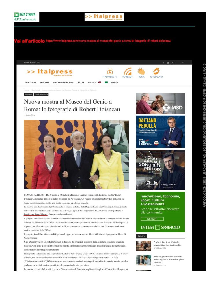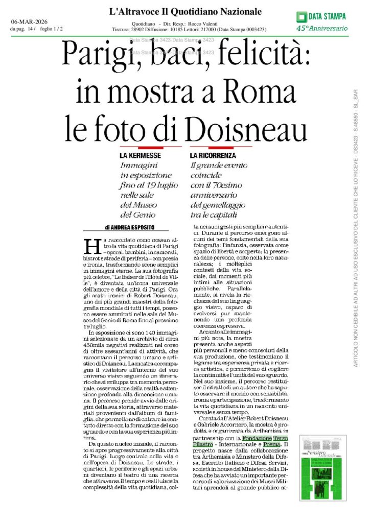 La Prof.ssa Alessandra Taccone, Presidente della Fondazione Terzo Pilastro – Internazionale, main partner del progetto, afferma: «Dopo il successo ottenuto dalla mostra di Vivian Maier, con la quale abbiamo riaperto al pubblico il Museo del Genio, la scelta di dedicare una monografica al fotografo francese Robert Doisneau risponde a una precisa volontà progettuale: desideriamo, infatti, da un lato onorare il bicentenario della nascita della fotografia, dall’altro celebrare il 70esimo anniversario del gemellaggio tra Roma e Parigi. L’opera di Doisneau testimonia perfettamente come oggi la fotografia non sia più una forma espressiva subordinata alla pittura, ma sia diventata un linguaggio artistico a pieno titolo, che interroga il reale, il dolore e la bellezza con assoluta dignità e autorevolezza. Utilizzando un approccio mai invasivo e spesso venato di sottile ironia, Doisneau ci sprona a cercare l’armonia nella vita quotidiana di Parigi, attraverso uno sguardo “laterale”, discreto, che non forza mai la realtà ma ne attende la verità spontanea. Nelle sue foto emerge un mondo ideale: più benevolo, più empatico, profondamente umano.».